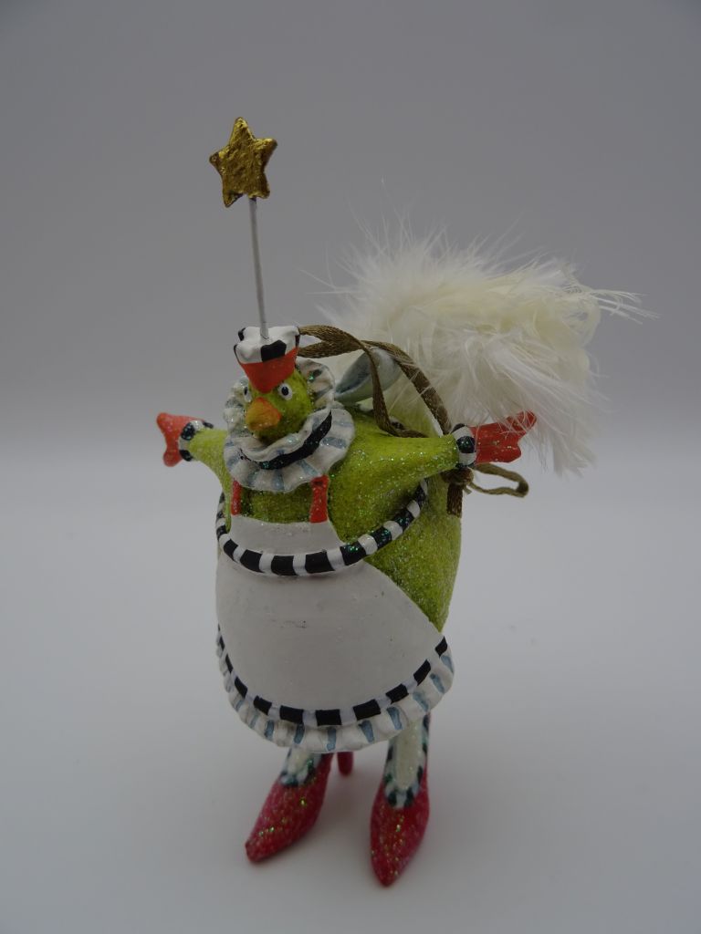Die lustige Henne mit Schürze ist zum aufhängen. Höhe 9 cm.