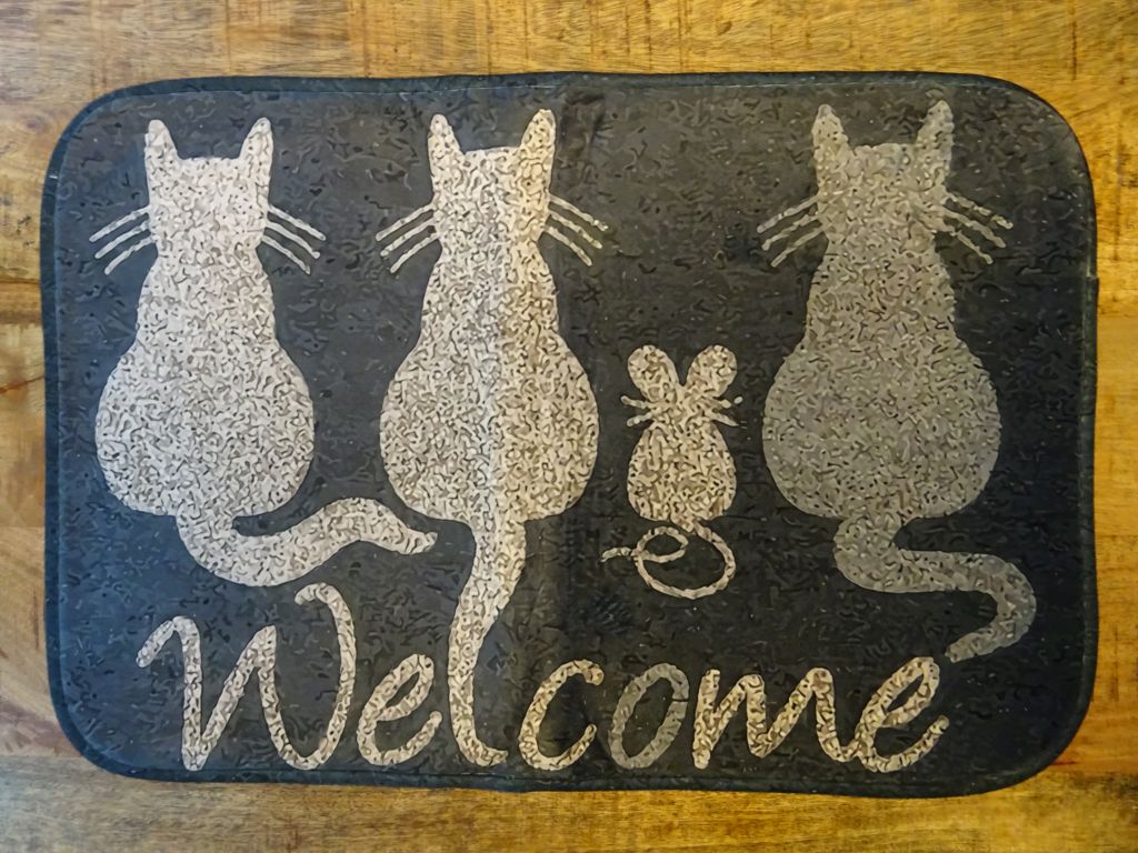 Lustiger Teppich mit drei Katzen und einer Maus, in der Grösse 50 cm x 60 cm. Die Rückseite hat kleine Gumminoppen. Der Teppich ist bei 40°C waschbar.